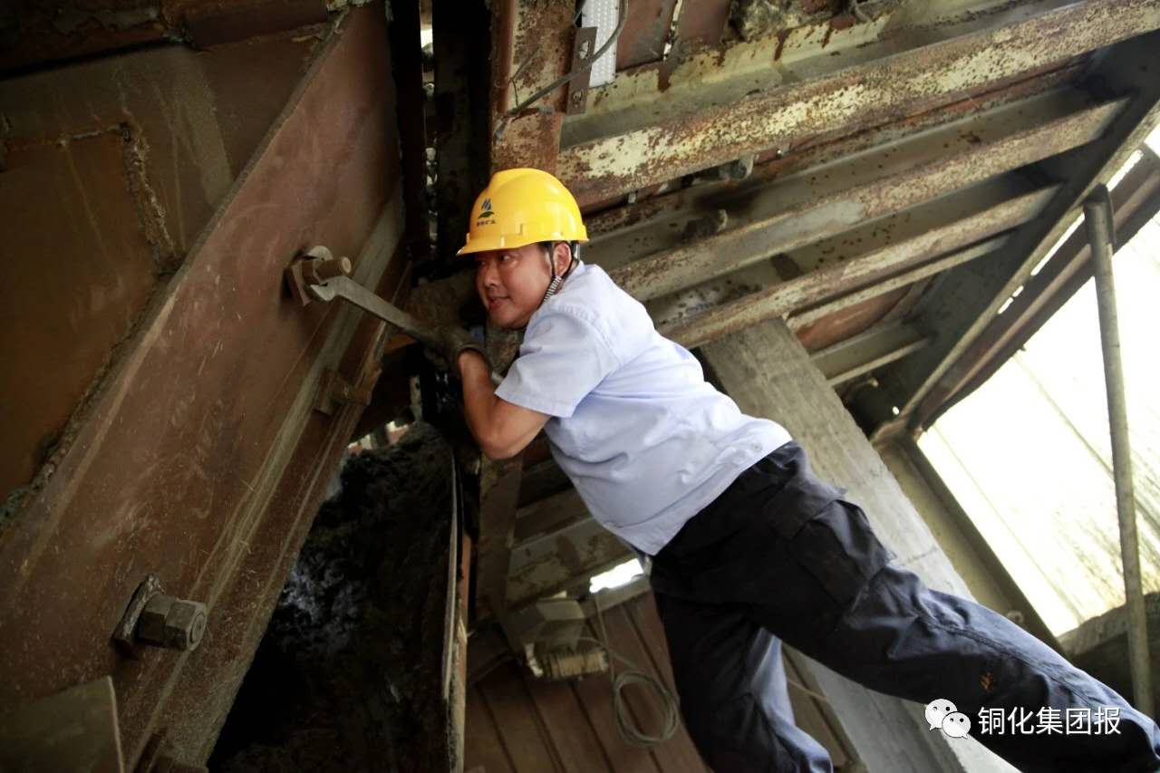 下了皮帶廊,走到主井礦倉下,老郭自豪地指著頭頂上方:“8個(gè)漏斗,過去維修和更換都是委外,現(xiàn)在都是我?guī)俗约焊伞《嗌馘X我不曉得,自己的事情就該自己干,能省一個(gè)是一個(gè)!”說到興奮時(shí),他還掏出手機(jī)上圖片給我講2個(gè)月前他們打的一場(chǎng)硬仗:主井35米礦倉漏斗因礦石提運(yùn)沖擊導(dǎo)致四邊混凝土嚴(yán)重磨損,礦業(yè)公司聽取老郭的建議,準(zhǔn)備為漏斗四邊安裝4塊鋼板以保護(hù)受損的混凝土墻體。為了最大限度減少對(duì)主井出礦的影響,只給他們48小時(shí)的停產(chǎn)時(shí)間。頭一次接這大活的老郭也沒犯怵,提前準(zhǔn)備好鋼板、木條等材料,將8名維修工分成3班,白班和小夜班清漏斗、制作安裝安全護(hù)板、鑲嵌鋼板,大夜班專門焊接鋼板??辛?天的方便面,提前2小時(shí)完工將漏斗交付使用……